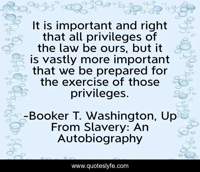 This page presents the quote "It is important and right that all privileges of the law be ours, but it is vastly more important that we be prepared for the exercise of those privileges.". Author of this quote is Booker T. Washington, Up From Slavery: An Autobiography. This quote is about slavery, rights,.