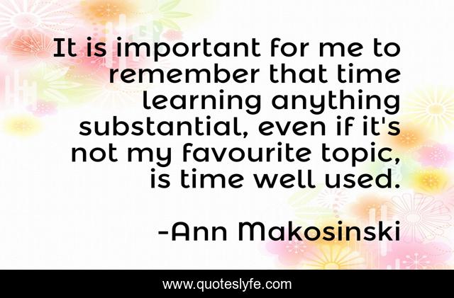 This page presents the quote "It is important for me to remember that time learning anything substantial, even if it's not my favourite topic, is time well used.". Author of this quote is Ann Makosinski. This quote is about me, remember, time,.