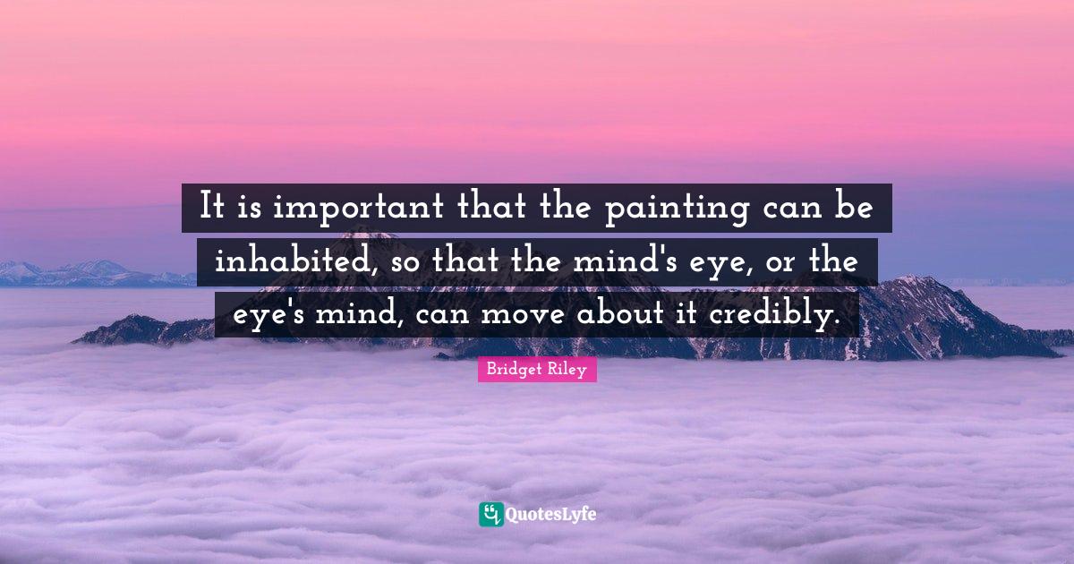 This page presents the quote "It is important that the painting can be inhabited, so that the mind's eye, or the eye's mind, can move about it credibly.". Author of this quote is Bridget Riley. This quote is about eye, mind, important, painting, moving,.