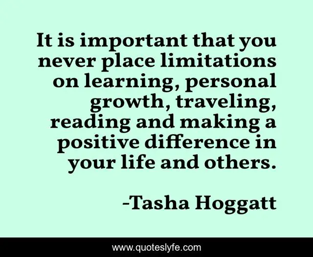 This page presents the quote "It is important that you never place limitations on learning, personal growth, traveling, reading and making a positive difference in your life and others.". Author of this quote is Tasha Hoggatt. This quote is about enthusiasm, inspirational, learning, growth-life,.