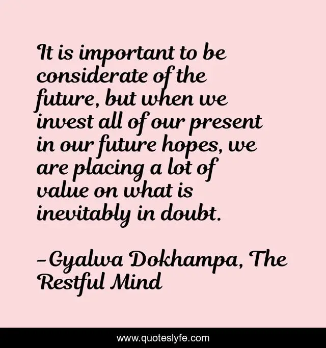 This page presents the quote "It is important to be considerate of the future, but when we invest all of our present in our future hopes, we are placing a lot of value on what is inevitably in doubt.". Author of this quote is Gyalwa Dokhampa, The Restful Mind. This quote is about hopes, future, present, doubtful,.