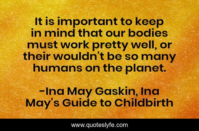 This page presents the quote "It is important to keep in mind that our bodies must work pretty well, or their wouldn't be so many humans on the planet.". Author of this quote is Ina May Gaskin, Ina May's Guide to Childbirth. This quote is about labor, health, birth, normal,.