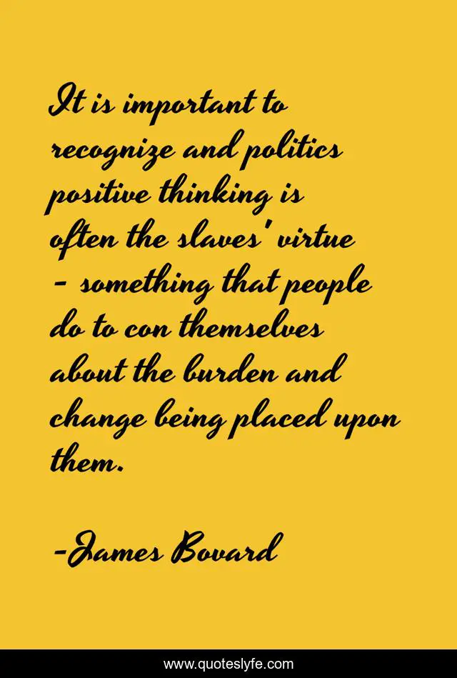 This page presents the quote "It is important to recognize and politics positive thinking is often the slaves' virtue - something that people do to con themselves about the burden and change being placed upon them.". Author of this quote is James Bovard. This quote is about thinking, politics, change,.