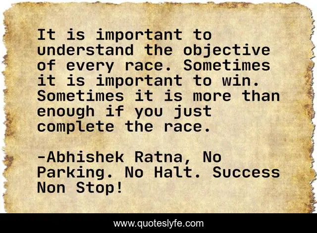 This page presents the quote "It is important to understand the objective of every race. Sometimes it is important to win. Sometimes it is more than enough if you just complete the race.". Author of this quote is Abhishek Ratna, No Parking. No Halt. Success Non Stop!. This quote is about life, success, success-self-improvement, life-lessons, successful-living, race-of-life,.