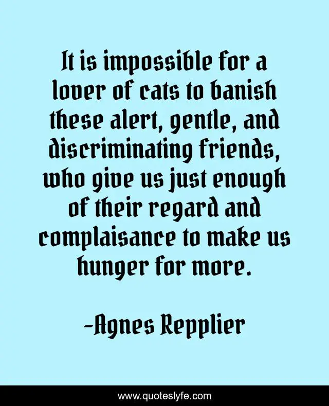 This page presents the quote "It is impossible for a lover of cats to banish these alert, gentle, and discriminating friends, who give us just enough of their regard and complaisance to make us hunger for more.". Author of this quote is Agnes Repplier. This quote is about impossible, cats, friends,.