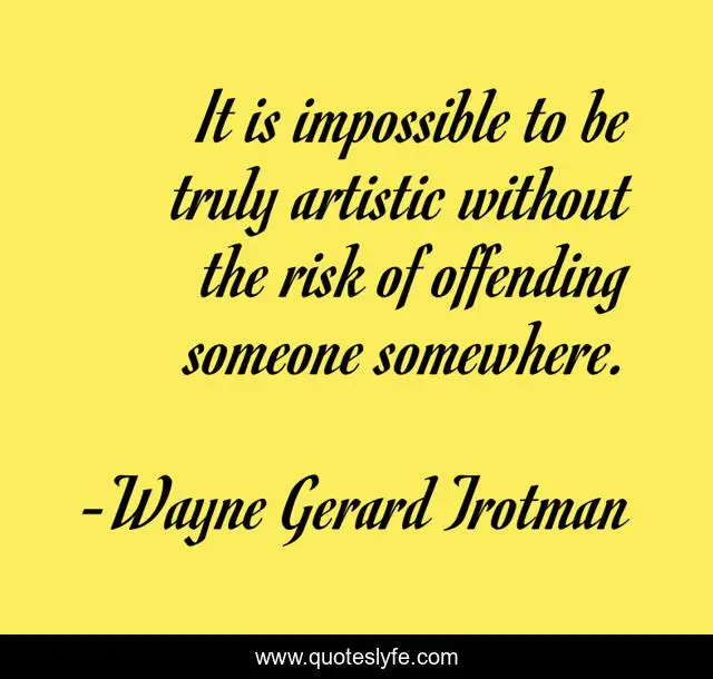 This page presents the quote "It is impossible to be truly artistic without the risk of offending someone somewhere.". Author of this quote is Wayne Gerard Trotman. This quote is about art, risk, artistic-freedom, offence, offensive, artistic-endeavor, artistic, artistic-expression, offend,.