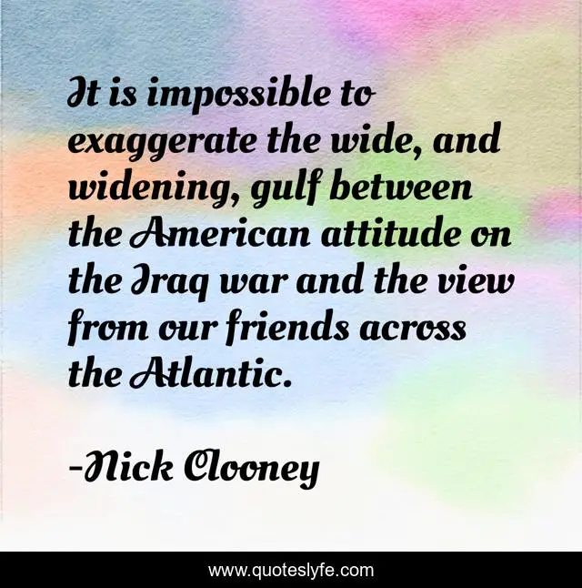 This page presents the quote "It is impossible to exaggerate the wide, and widening, gulf between the American attitude on the Iraq war and the view from our friends across the Atlantic.". Author of this quote is Nick Clooney. This quote is about american, friends, war,.