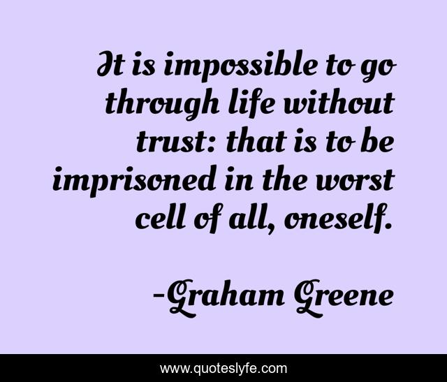 This page presents the quote "It is impossible to go through life without trust: that is to be imprisoned in the worst cell of all, oneself.". Author of this quote is Graham Greene. This quote is about impossible, life, through,.