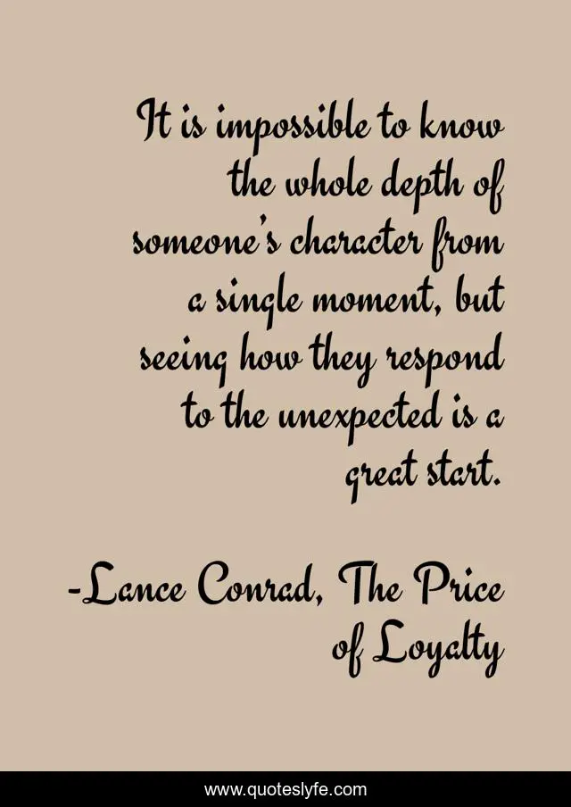 This page presents the quote "It is impossible to know the whole depth of someone’s character from a single moment, but seeing how they respond to the unexpected is a great start.". Author of this quote is Lance Conrad, The Price of Loyalty. This quote is about reactions, characer-development, personality,.
