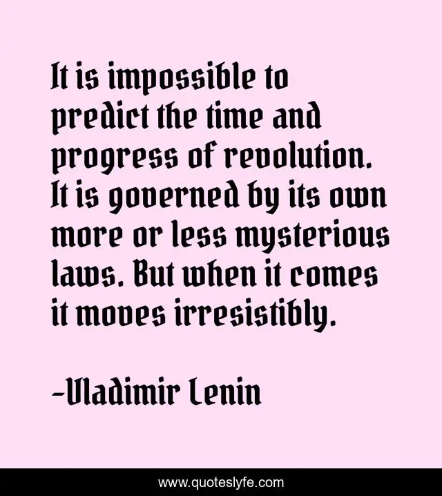 This page presents the quote "It is impossible to predict the time and progress of revolution. It is governed by its own more or less mysterious laws. But when it comes it moves irresistibly.". Author of this quote is Vladimir Lenin. .