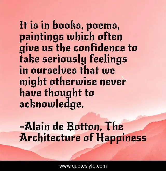 This page presents the quote "It is in books, poems, paintings which often give us the confidence to take seriously feelings in ourselves that we might otherwise never have thought to acknowledge.". Author of this quote is Alain de Botton, The Architecture of Happiness. This quote is about emotion, art,.