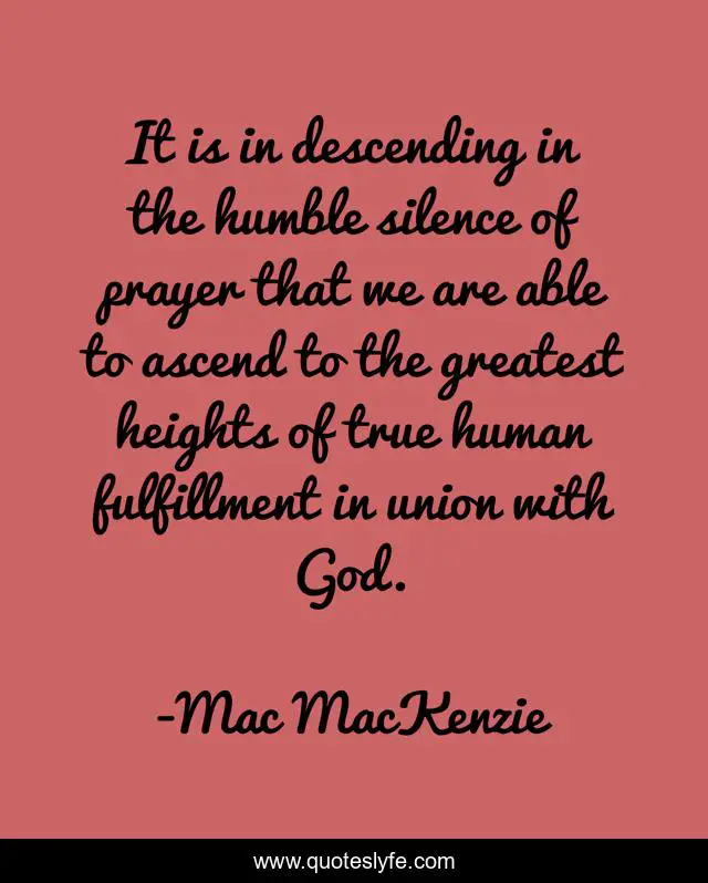 This page presents the quote "It is in descending in the humble silence of prayer that we are able to ascend to the greatest heights of true human fulfillment in union with God.". Author of this quote is Mac MacKenzie. This quote is about god, silence, prayer,.