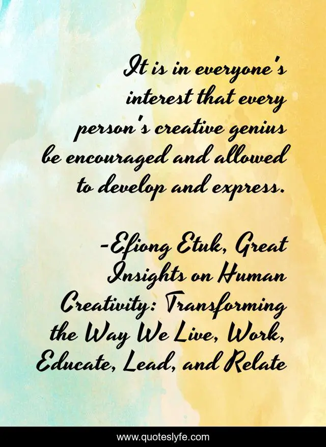 This page presents the quote "It is in everyone's interest that every person's creative genius be encouraged and allowed to develop and express.". Author of this quote is Efiong Etuk, Great Insights on Human Creativity: Transforming the Way We Live, Work, Educate, Lead, and Relate. This quote is about genius, mass-creativity, creativity,.