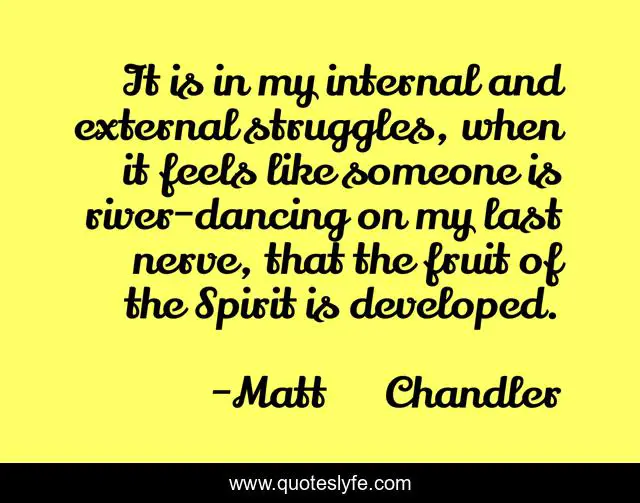 This page presents the quote "It is in my internal and external struggles, when it feels like someone is river-dancing on my last nerve, that the fruit of the Spirit is developed.". Author of this quote is Matt Chandler. This quote is about emotion, discipleship,.