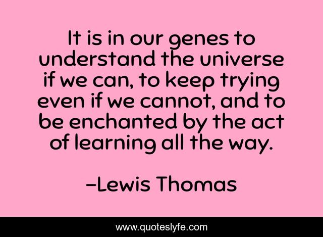 This page presents the quote "It is in our genes to understand the universe if we can, to keep trying even if we cannot, and to be enchanted by the act of learning all the way.". Author of this quote is Lewis Thomas. This quote is about science, genes, understanding, understand, learning, universe, persistence,.