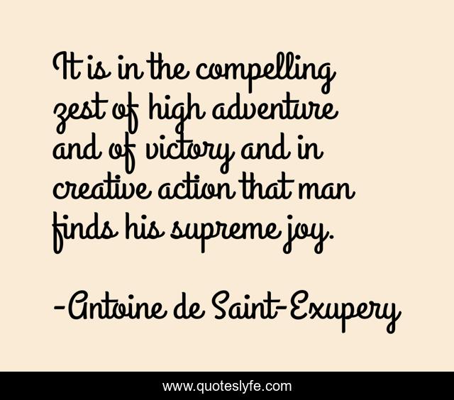 This page presents the quote "It is in the compelling zest of high adventure and of victory and in creative action that man finds his supreme joy.". Author of this quote is Antoine de Saint-Exupery. .