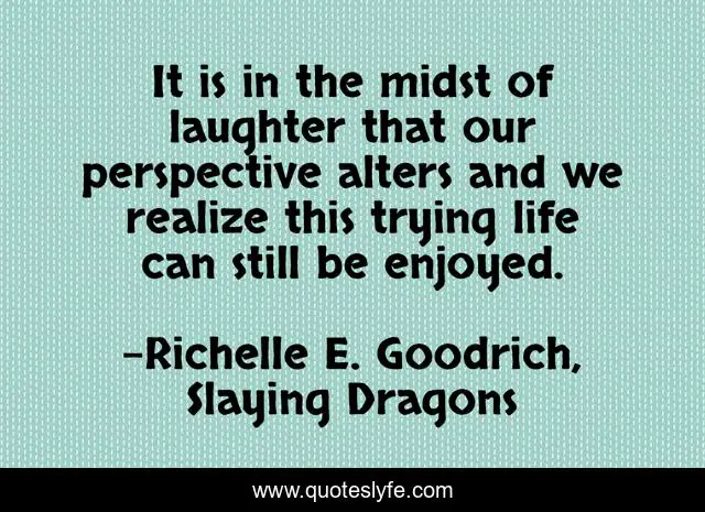 This page presents the quote "It is in the midst of laughter that our perspective alters and we realize this trying life can still be enjoyed.". Author of this quote is Richelle E. Goodrich, Slaying Dragons. This quote is about life, humor, richelle-e-goodrich, richelle, perspective, laugh, richelle-goodrich, laughter,.