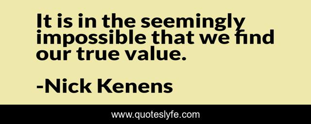 This page presents the quote "It is in the seemingly impossible that we find our true value.". Author of this quote is Nick Kenens. This quote is about motivation, positive, motivational, confidence, value, optimistic, inspirational, impossible, enthusiasm,.