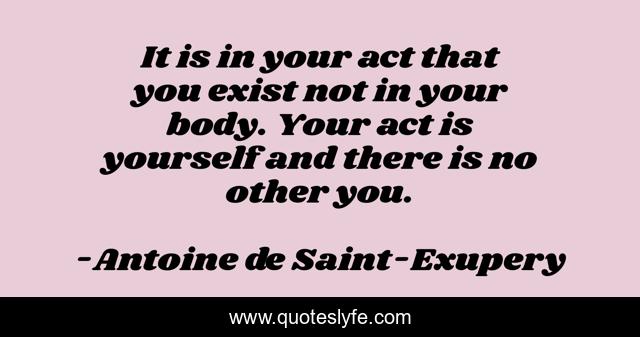 This page presents the quote "It is in your act that you exist not in your body. Your act is yourself and there is no other you.". Author of this quote is Antoine de Saint-Exupery. This quote is about going, getting,.