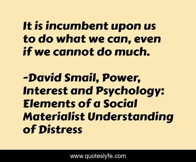 This page presents the quote "It is incumbent upon us to do what we can, even if we cannot do much.". Author of this quote is David Smail, Power, Interest and Psychology: Elements of a Social Materialist Understanding of Distress. This quote is about action, social-activism, responsibility,.