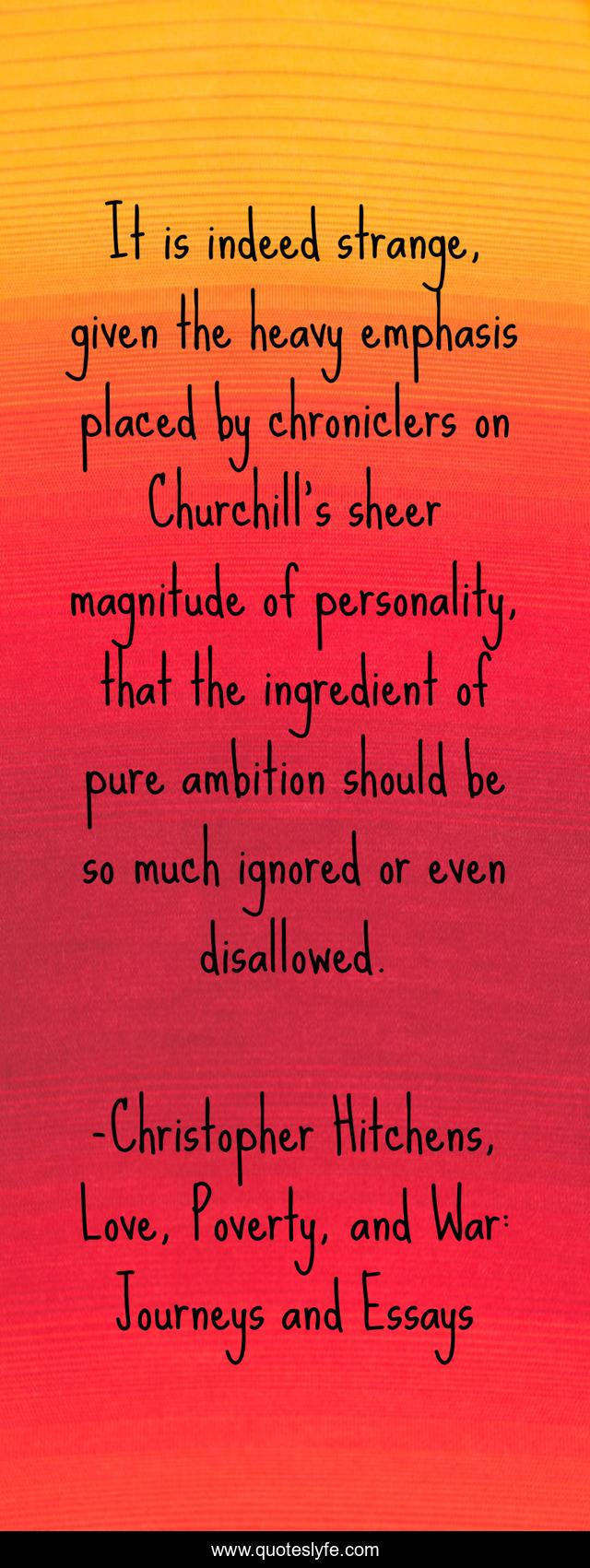This page presents the quote "It is indeed strange, given the heavy emphasis placed by chroniclers on Churchill's sheer magnitude of personality, that the ingredient of pure ambition should be so much ignored or even disallowed.". Author of this quote is Christopher Hitchens, Love, Poverty, and War: Journeys and Essays. This quote is about ambition, winston-churchill, biography, larger-than-life, personality,.