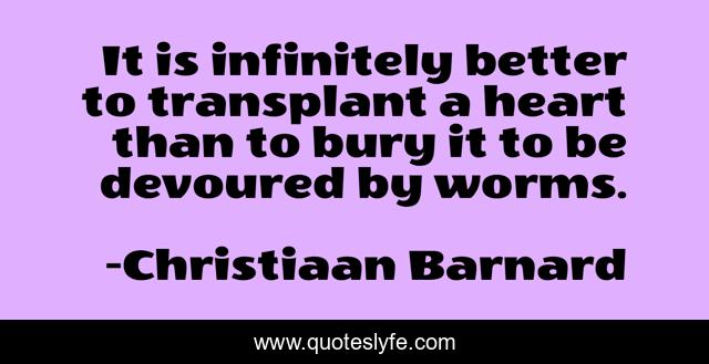 This page presents the quote "It is infinitely better to transplant a heart than to bury it to be devoured by worms.". Author of this quote is Christiaan Barnard. This quote is about science, decision, choice, better, organ-donors, transplant,.