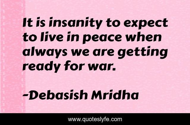This page presents the quote "It is insanity to expect to live in peace when always we are getting ready for war.". Author of this quote is Debasish Mridha. This quote is about life, love, knowledge, inspirational, intelligence, philosophy, wisdom, quotes, affection,.