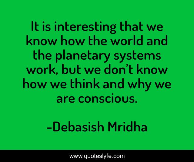This page presents the quote "It is interesting that we know how the world and the planetary systems work, but we don’t know how we think and why we are conscious.". Author of this quote is Debasish Mridha. This quote is about how-the-world-works, consciousness, philosophy, debasish-mridha, quotes, debasish-mridha-md, inspirational, enthusiasm, how-the-planetary-systems-work,.