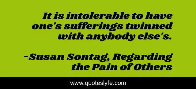 This page presents the quote "It is intolerable to have one's sufferings twinned with anybody else's.". Author of this quote is Susan Sontag, Regarding the Pain of Others. This quote is about books, book, regarding-the-pain-of-others, susan-sontag,.