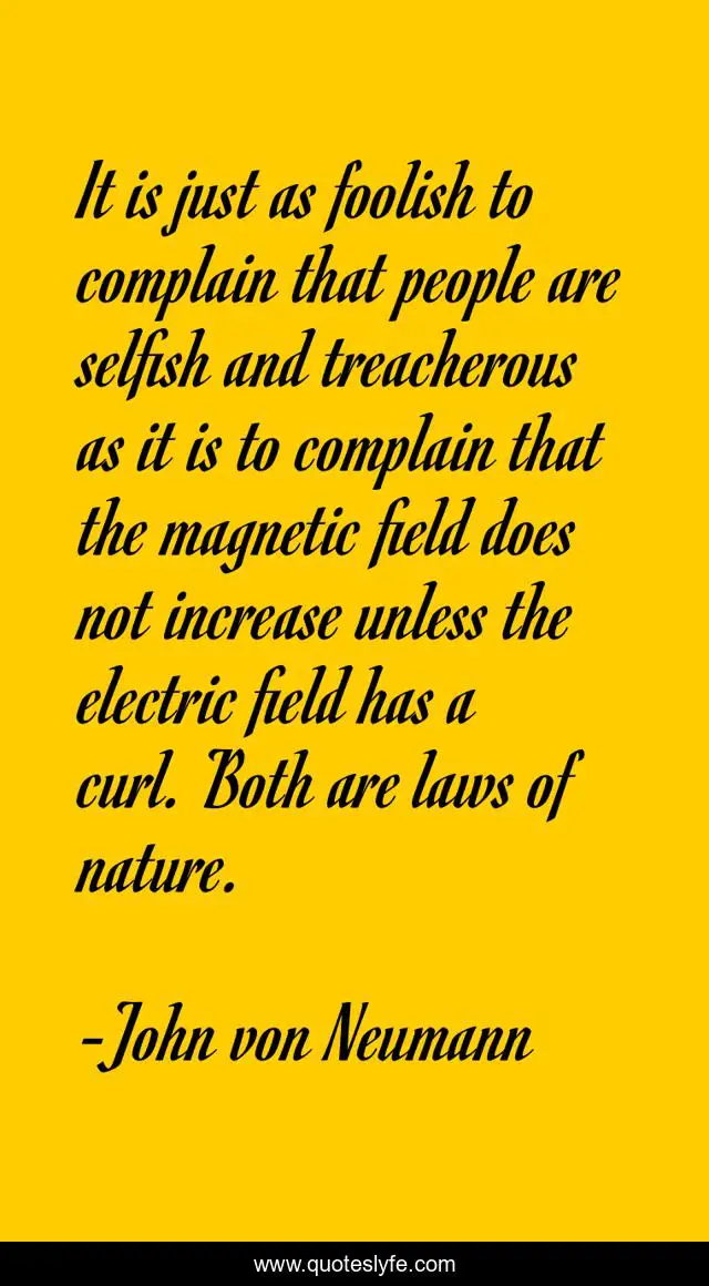 This page presents the quote "It is just as foolish to complain that people are selfish and treacherous as it is to complain that the magnetic field does not increase unless the electric field has a curl. Both are laws of nature.". Author of this quote is John von Neumann. This quote is about human-nature, humor,.