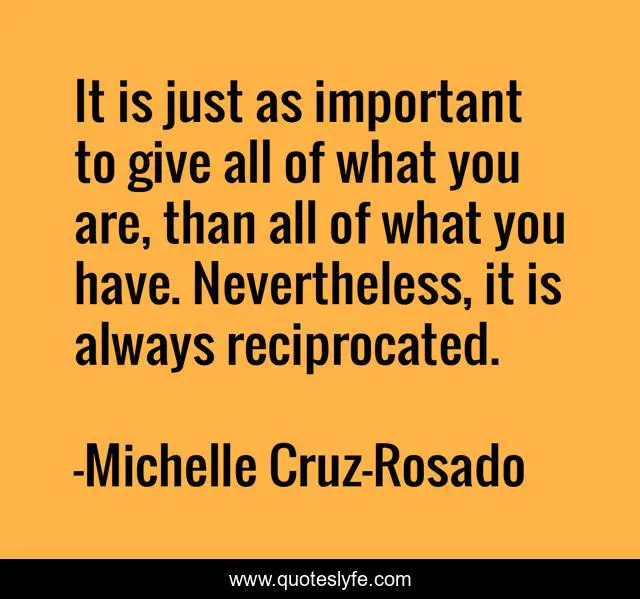 This page presents the quote "It is just as important to give all of what you are, than all of what you have. Nevertheless, it is always reciprocated.". Author of this quote is Michelle Cruz-Rosado. This quote is about motivational-inspirational, michelle-rosado,.