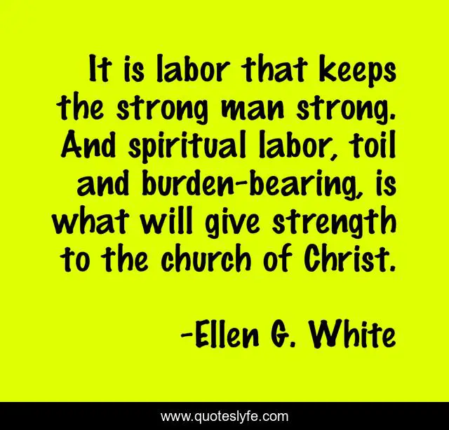This page presents the quote "It is labor that keeps the strong man strong. And spiritual labor, toil and burden-bearing, is what will give strength to the church of Christ.". Author of this quote is Ellen G. White. This quote is about spiritual, strong, man,.