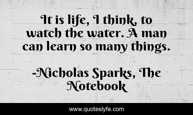 This page presents the quote "It is life, I think, to watch the water. A man can learn so many things.". Author of this quote is Nicholas Sparks, The Notebook. This quote is about water, life,.