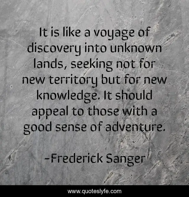 This page presents the quote "It is like a voyage of discovery into unknown lands, seeking not for new territory but for new knowledge. It should appeal to those with a good sense of adventure.". Author of this quote is Frederick Sanger. This quote is about unknown, good, adventure,.