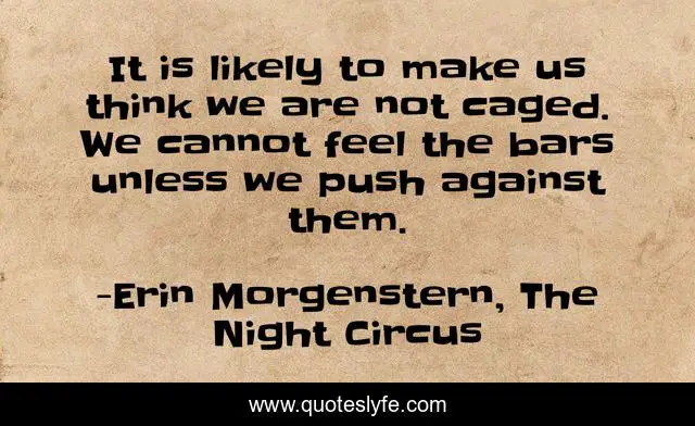 This page presents the quote "It is likely to make us think we are not caged. We cannot feel the bars unless we push against them.". Author of this quote is Erin Morgenstern, The Night Circus. This quote is about free-will, imprisonment, independence,.