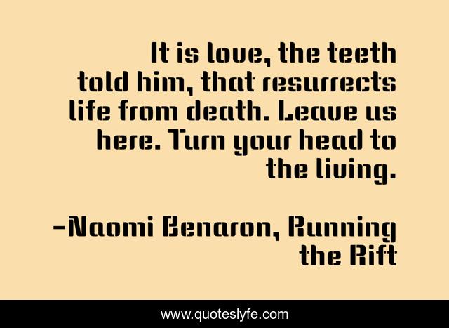This page presents the quote "It is love, the teeth told him, that resurrects life from death. Leave us here. Turn your head to the living.". Author of this quote is Naomi Benaron, Running the Rift. This quote is about living, love, affection,.