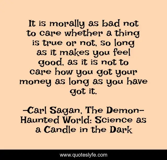 This page presents the quote "It is morally as bad not to care whether a thing is true or not, so long as it makes you feel good, as it is not to care how you got your money as long as you have got it.". Author of this quote is Carl Sagan, The Demon-Haunted World: Science as a Candle in the Dark. This quote is about science, morality, truth, sagan,.