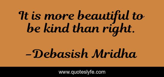 This page presents the quote "It is more beautiful to be kind than right.". Author of this quote is Debasish Mridha. This quote is about beautiful, philosophy, debasish-mridha, be-kind, quotes, debasish-mridha-md, inspirational, enthusiasm, be-kind-rather-than-right,.