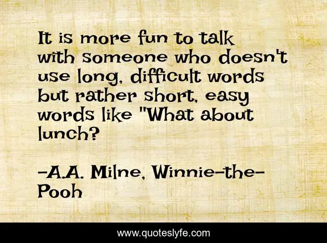 This page presents the quote "It is more fun to talk with someone who doesn't use long, difficult words but rather short, easy words like "What about lunch?". Author of this quote is A.A. Milne, Winnie-the-Pooh. .
