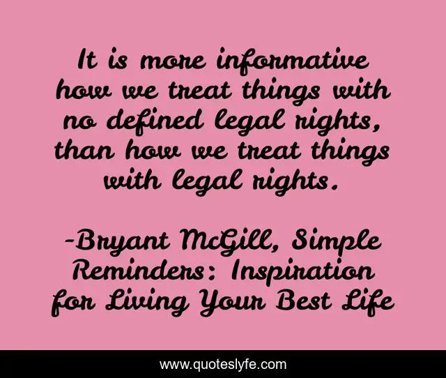 This page presents the quote "It is more informative how we treat things with no defined legal rights, than how we treat things with legal rights.". Author of this quote is Bryant McGill, Simple Reminders: Inspiration for Living Your Best Life. This quote is about information, legality, rights,.