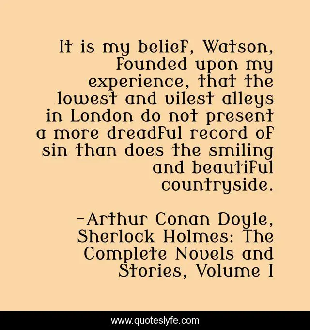 This page presents the quote "It is my belief, Watson, founded upon my experience, that the lowest and vilest alleys in London do not present a more dreadful record of sin than does the smiling and beautiful countryside.". Author of this quote is Arthur Conan Doyle, Sherlock Holmes: The Complete Novels and Stories, Volume I. This quote is about beautiful, love, vile, countryside, experience, john-watson, london, alleys, rural-life,.