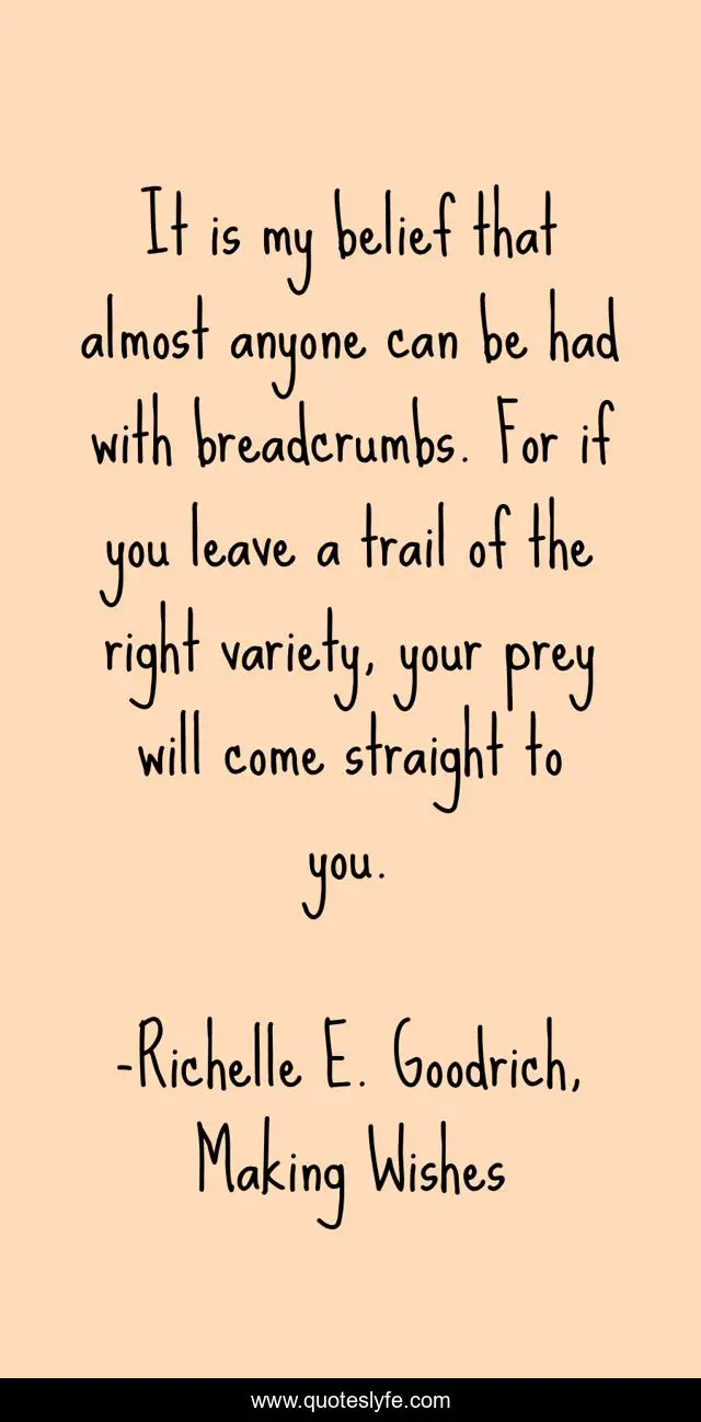 This page presents the quote "It is my belief that almost anyone can be had with breadcrumbs. For if you leave a trail of the right variety, your prey will come straight to you.". Author of this quote is Richelle E. Goodrich, Making Wishes. This quote is about lure, breadcrumbs, enticements, richelle, entice, richelle-e-goodrich, richelle-goodrich, temptations,.