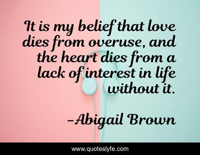 This page presents the quote "It is my belief that love dies from overuse, and the heart dies from a lack of interest in life without it.". Author of this quote is Abigail Brown. This quote is about the-heart, love, beliefs, affection, wisdom,.