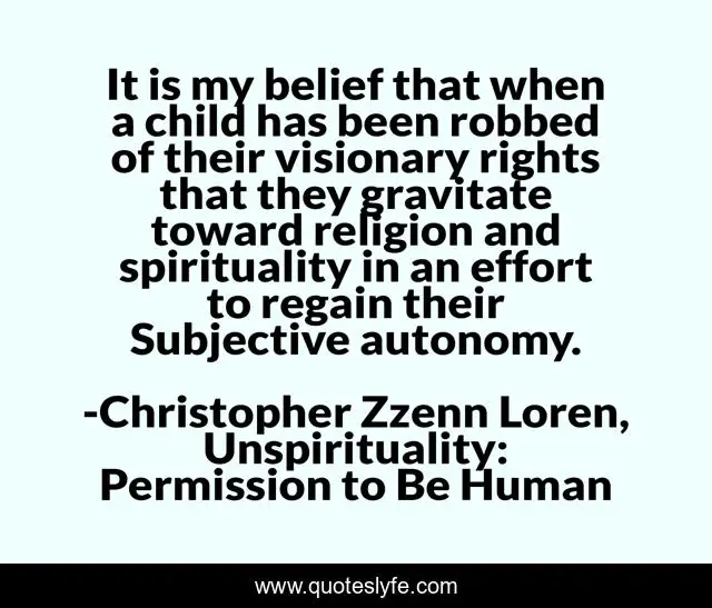 This page presents the quote "It is my belief that when a child has been robbed of their visionary rights that they gravitate toward religion and spirituality in an effort to regain their Subjective autonomy.". Author of this quote is Christopher Zzenn Loren, Unspirituality: Permission to Be Human. This quote is about religion, christianity, atheism, spirituality, unspirituality, naturalism,.