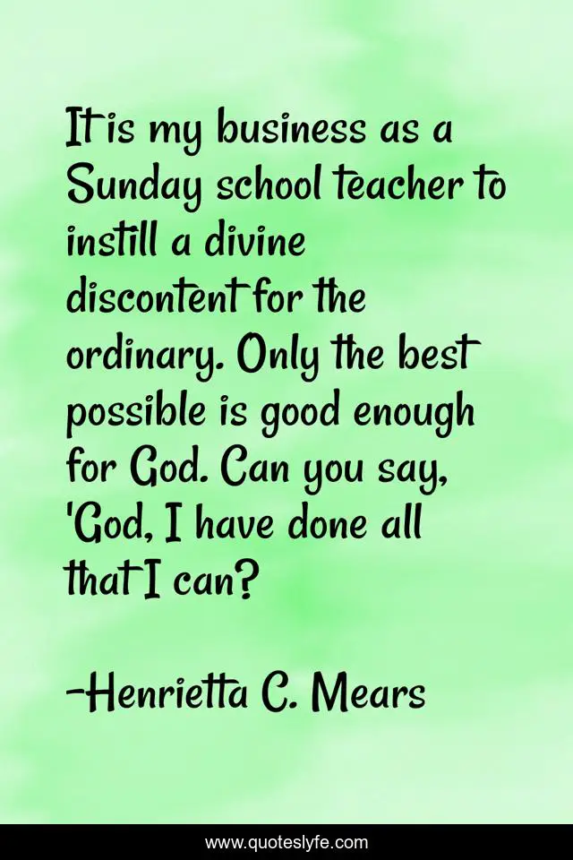 This page presents the quote "It is my business as a Sunday school teacher to instill a divine discontent for the ordinary. Only the best possible is good enough for God. Can you say, 'God, I have done all that I can?". Author of this quote is Henrietta C. Mears. This quote is about discontent, school, good, god, sunday, ordinary, teacher, best,.