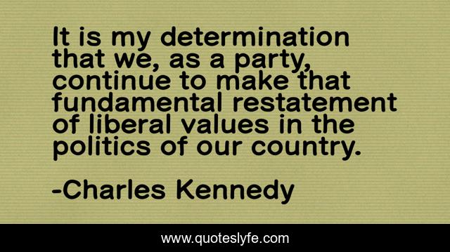 This page presents the quote "It is my determination that we, as a party, continue to make that fundamental restatement of liberal values in the politics of our country.". Author of this quote is Charles Kennedy. This quote is about determination, values, party,.