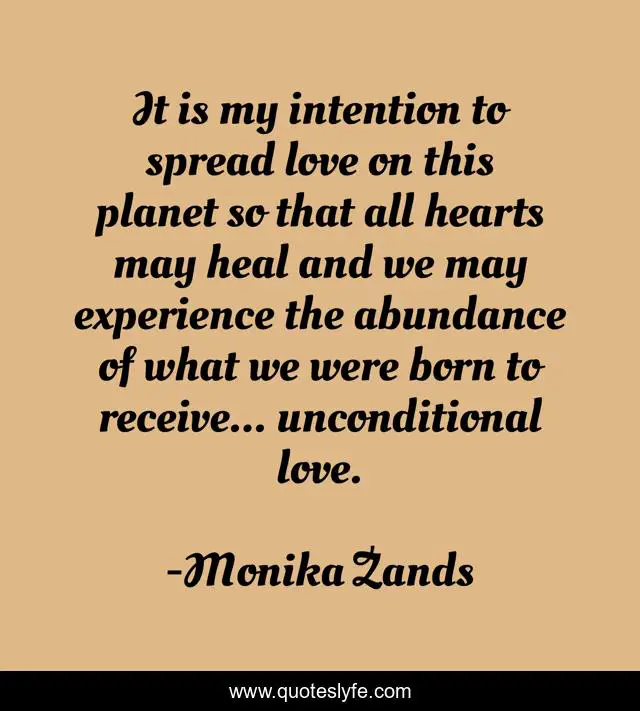 This page presents the quote "It is my intention to spread love on this planet so that all hearts may heal and we may experience the abundance of what we were born to receive... unconditional love.". Author of this quote is Monika Zands. This quote is about love, intention, spirituality, healing, personal-development, affection,.