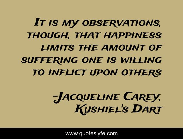This page presents the quote "It is my observations, though, that happiness limits the amount of suffering one is willing to inflict upon others". Author of this quote is Jacqueline Carey, Kushiel's Dart. This quote is about sorrow, happiness,.