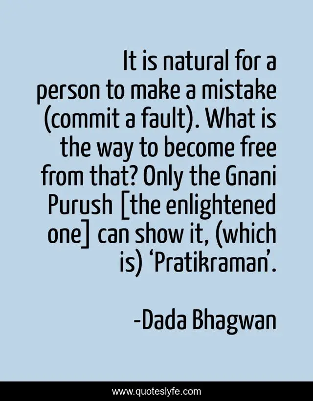This page presents the quote "It is natural for a person to make a mistake (commit a fault). What is the way to become free from that? Only the Gnani Purush [the enlightened one] can show it, (which is) ‘Pratikraman’.". Author of this quote is Dada Bhagwan. This quote is about spiritual, natural, fault, person, gnani-purush, enlightened,.