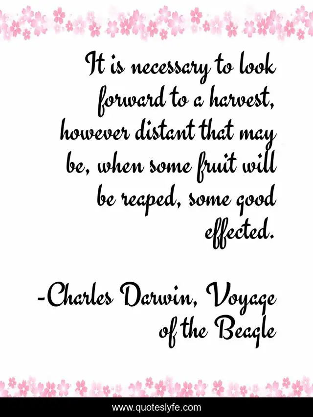 This page presents the quote "It is necessary to look forward to a harvest, however distant that may be, when some fruit will be reaped, some good effected.". Author of this quote is Charles Darwin, Voyage of the Beagle. This quote is about confidence, positive, motivational, goals, forward, optimistic,.